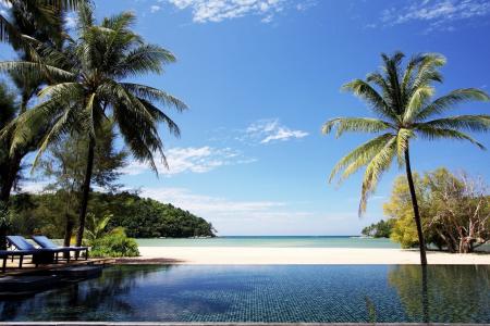 Частная вилла с большой открытой площадкой с собственным бассейном, кровать размера king size или две односпальные кровати, прямо на пляже.